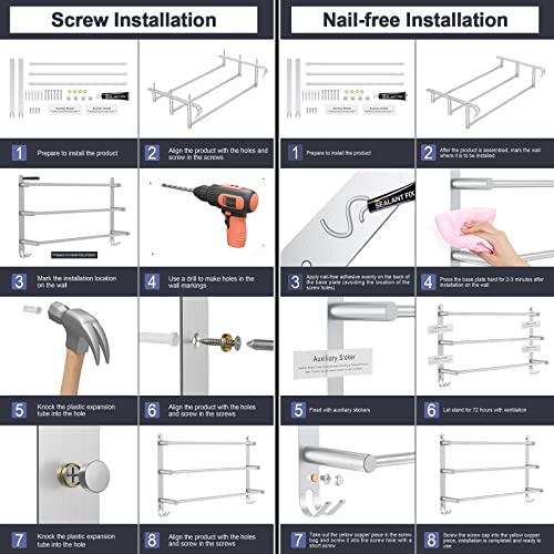 Uitstekend draagvermogen: de diameter van de stang van de handdoekhouder bedraagt 1,2 cm, waardoor een draagvermogen van ten minste 20 kg kan worden bereikt. Je hoeft er alleen maar voor te zorgen dat je het volgens de instructies installeert. Bovendien is de gatvrije montagemethode niet geschikt voor zachte of oneffen oppervlakken
